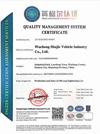 Wucheng Shujie Vehicle Industry Co., Ltd. is located in the intersection area of the Bohai Rim Economic Circle, the Beijing Tianjin Hebei Economic Circle, the Shandong Peninsula Blue Economic Zone, and the Yellow River Delta Efficient Ecological Economic Zone, as well as the Canal Culture Corridor - the Old Town Industrial and Trade Park of Wucheng County, Dezhou City, Shandong Province. With a registered capital of 10 million yuan, the company mainly engages in the development and production of off-road electric vehicles. The company's existing products include scenic spot sightseeing vehicles, golf carts, factory electric trucks, workshop handling vehicles, camp commuting vehicles, farm leisure shuttle vehicles, police patrol vehicles, real estate viewing vehicles, property inspection vehicles, community micro fire trucks and other vehicles.
