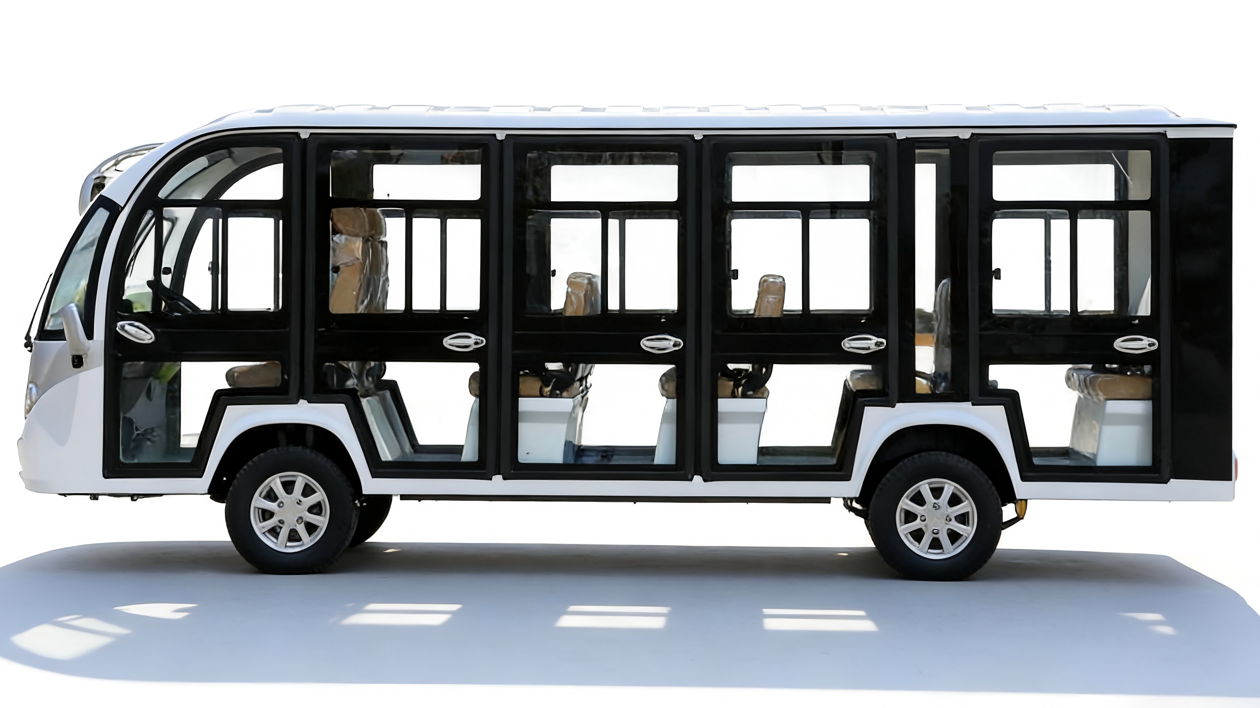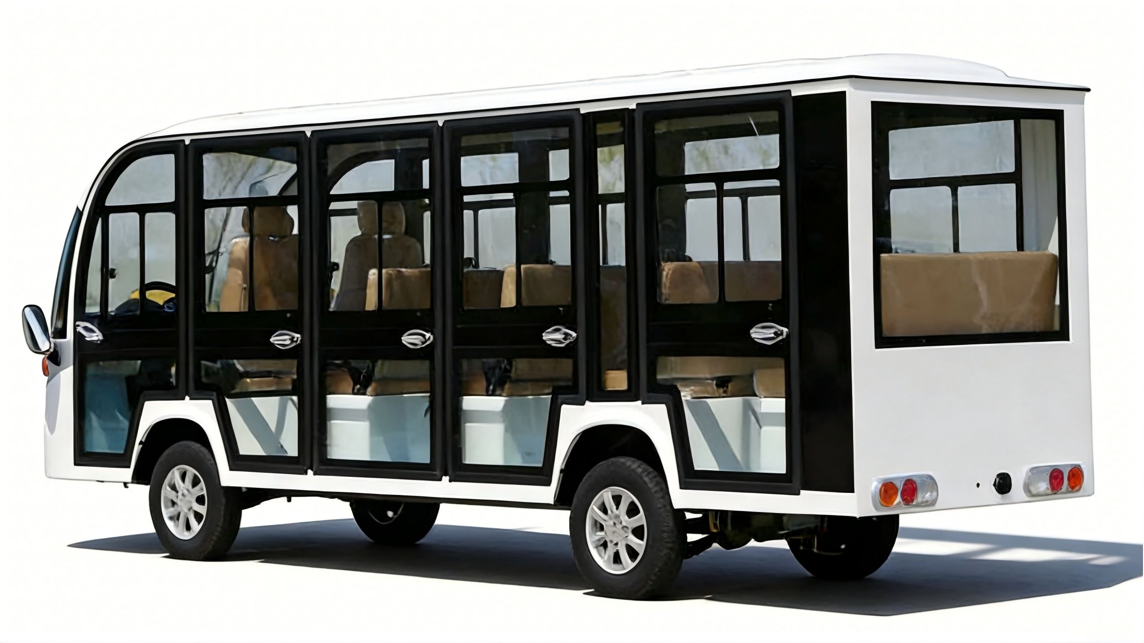 Enclosed sightseeing vehicle with 5 rows of seats, accommodating 10-14 people.